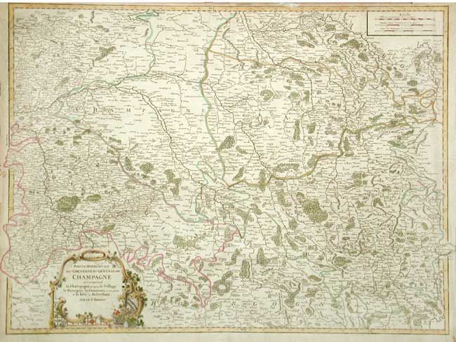 Delicately engraved and nicely colored map of the famous Champagne area. Locates hundreds of villages and towns. Good topography and watershed detail. Fine rococo-style cartouche, three distance scales.