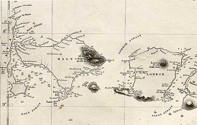 Great large-scale sea chart of the Indonesian islands filled with impressive detail. Includes several insets of important bays and harbors. The East India Company carried out the charting and marine surveys of the region from the appointment of the first hydrographer in 1779 until the company's demise in 1858. This chart was originally published in 1851 based on these surveys and includes corrections made to May 1864 by the Hydrographic Office of the Admiralty. Label of the Blundell & Fored, Admiralty Chart Agents, Melbourne in bottom margin.