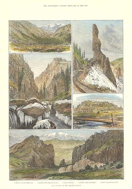 Three nice, hand colored, wood engravings from this important British newspaper. Indians of the Far West (1858) is a full-page (14 x 9.7") with six separate views from Emory's Mexican Boundary Survey. North American Indians Attacking a Mail Coach by R.C. Woodville (1885) is a double-page (17.2 x 13.2"). This is a fabulous night scene filled with action. The Denver and Rio Grande Railway is a full-page (9 x 13") with five scenes along the railway including the Pueblo of Taos.