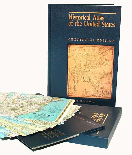 Beautiful book fully illustrated with photographs and maps telling the history of the land, people, economy, political boundaries, etc. 289 pp. Hardbound in blue cloth complete with separate portfolio of Guide Maps to U.S. History with sixteen large folding maps and a magnifier (still in protective wrap). All fitting into dark blue slipcase with gilt title on spine and case.