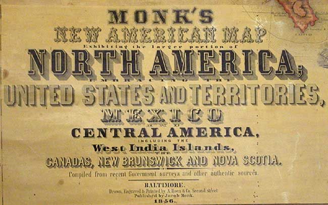 A majestic wall map that was published as the United States was expanding westward to the Pacific following the land gains from the Mexican War and the excitement from the California gold discoveries. Territorial development includes Utah, New Mexico, Kansas, and Nebraska. Washington and Oregon extend to the Continental Divide and to Nebraska Territory, which itself extends to Minnesota. Utah fills the large region between California and Kansas Territory. Oklahoma is unnamed and divided into three regions: Chah-lah-kee, Miscogee, and Cha-Ta. Minnesota includes Dakota, which has two regions: Pembina and Blue Earth. Details two proposed rail routes to the Pacific, plus the Oregon and California trails. The gold region in California is well detailed and filled with cities and roads. Names scores of towns and mining areas including Auburn, Coloma, Placerville, etc. No sign of Lake Tahoe. The map is filled with wagon routes, explorer trails, forts, Indian tribes, and so much more. Table of distances and another lists over 1,200 counties and county seats. Large inset of the World on Mercator's projection. Published by Hoen & Company.