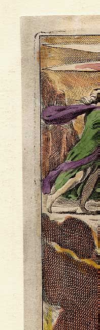 Striking twin hemisphere world map from a folio Dutch Bible. Surrounded by fabulous scenes from the Visscher-Berchem map of 1658 with astronomical diagrams in place of the north and south polar circles. These classic scenes depict the abduction of Persephone, Zeus being carried across the heavens in an eagle-drawn chariot, Poseidon commanding his entourage, and Demete receiving the fruits of the Earth. California is depicted as an Island with a flat northern coast labeled Nova Albion, and a small island at about where Alaska is located labeled Anian. In Asia the Great Wall of China is shown. Northern and Western Australia, Van Diemens Landt and New Zealand are shown with incomplete coastlines.