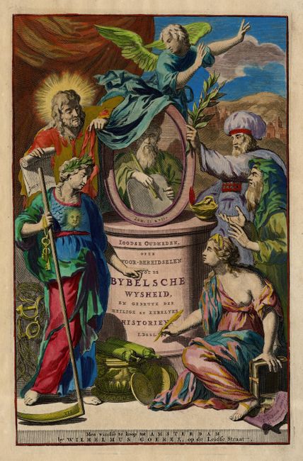A very attractive title page from a Dutch history of the Bible. Beautifully engraved with biblical figures and Jerusalem in the background.