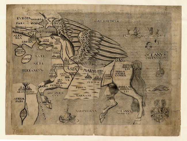 Among the earliest cartographic oddities are the famous maps from Heinrick Bunting's unusual travel book based on the Bible. This map of Asia is presented as the mythical winged horse Pegasus. The horse is drawn fairly realistically, so that a good deal of imagination is required to view the map. The head represents Asia Minor with the mouth at Istanbul. The wings portray Central Asia and Siberia with the Caspian Sea laying horizontally between the wings and the saddle. Persia is delineated on the horse blanket with the forelegs forming Arabia. The hind legs represent the Indian and Malay peninsulas. This is a very rare issue of the map from a Czech edition. The original woodcut map was re-engraved on copper with a stippled sea and the inclusion of several additional embellishments including a coat of arms. Color copy of the atlas title page included.