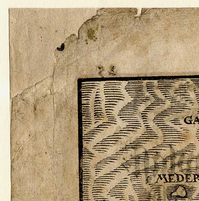 Light soil throughout. Backed with sturdy tissue and some paper replaced, most significantly a couple of large wormholes at center and the lower left corner, with image replaced in ink.