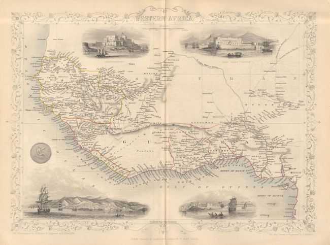 Decorative map extending from Senegal to the Bight of Biafra filled with detail and surrounded in a delicate border. Finely engraved vignettes include Christiansborg, Cape Coast Castle, Bakel, Sierra Leone and a coin.