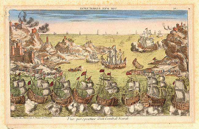 Scarce Vue d'Optique of a naval battle. The engraving was designed to be viewed in a special apparatus that gave the view a strong 3-D impression. The title at top is engraved in reverse and another title is engraved at bottom for use outside the viewer. These prints were only produced for a short period of time, as they were replaced with the smaller steroviewer.