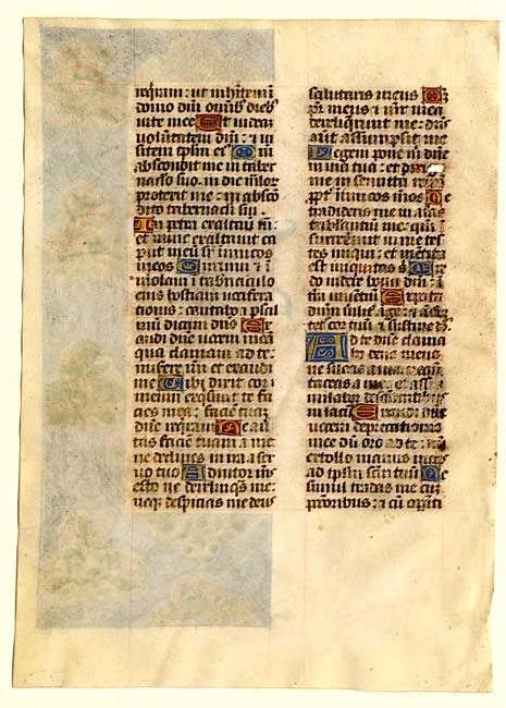 A wonderful manuscript on vellum from a breviary, made for a Prince of the Church. Written in a gothic bookhand, with illuminated initials of liquid gold against grounds of red and blue with gold decorations. One historiated initial 'D', six-lines high, contains a fine miniature of David before he was anointed. Splendid borders painted on a rich maroon ground with acanthus leaves, flowers, and birds. The text is from Psalm 26 (27 KJV). This leaf is from a Breviary that was the property of Bertrand de Chalencon, Bishop of Rodez, Tours, circa 1490.