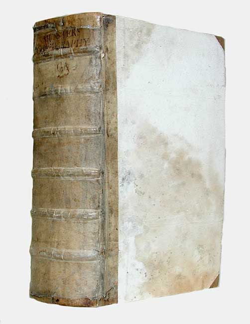 Sebastian Munster probably had more influence in spreading geographical knowledge throughout Europe in the mid-sixteenth century than any of this contemporaries. His Cosmographia contained not only the latest maps and city views, but also included an encyclopedic amount of detail about the known, and unknown, world and its history. This German edition was published by Sebastian Petri and unlike most issues from this period, was printed on good quality paper. The volume includes two world maps, the four continents, 20 regional maps, plus over 1200 woodcuts including 70 double-page and 2 large folding plans (Vienna and Heidelberg). These include the famous plates of Europa Regina and Munster's Monsters. Small Folio, 1459 pp. (of 1461) lacking one leaf of text and the frontispiece. Contemporary vellum binding with six raised bands, recovered with modern end papers. A few pages at front and rear with loss (which appear to have been expurgated by a demented heretic, or perhaps an unruly child). The lost paper has been replaced with contemporary paper. The folding plates are frayed as is almost always the case, but otherwise the maps and plates are in remarkable condition. Bookplate of Dr. Fritz Eberhard, 1964 on endpaper.