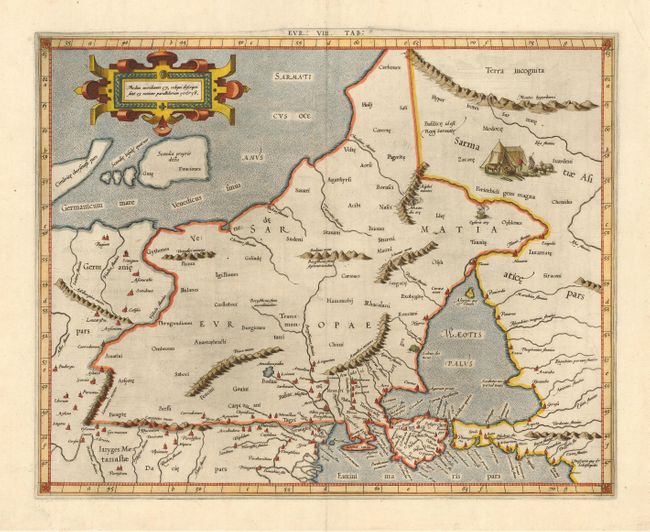 Attractive Ptolemaic map covering eastern Europe from the Baltic through the Black Sea known in ancient times as Sarmatia and Tauricam Chersonese. The map is decorated with a strapwork title cartouche and a tent encampment. From the edition compiled by Bertius and published by Jodocus Hondius.