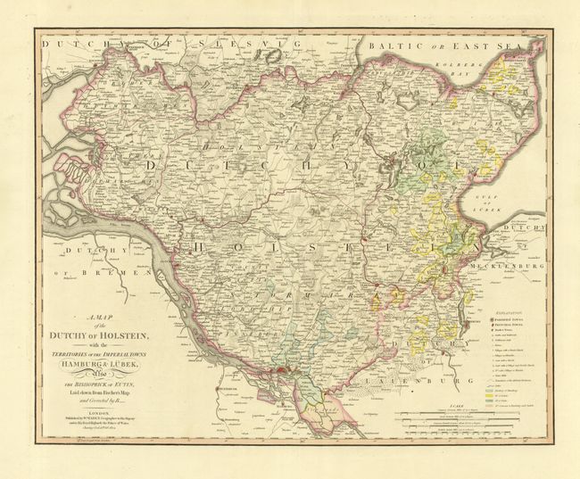 A handsome map of Holstein with superb detail of roads, fortified towns, villages, castles, dikes, churches, mills, etc.