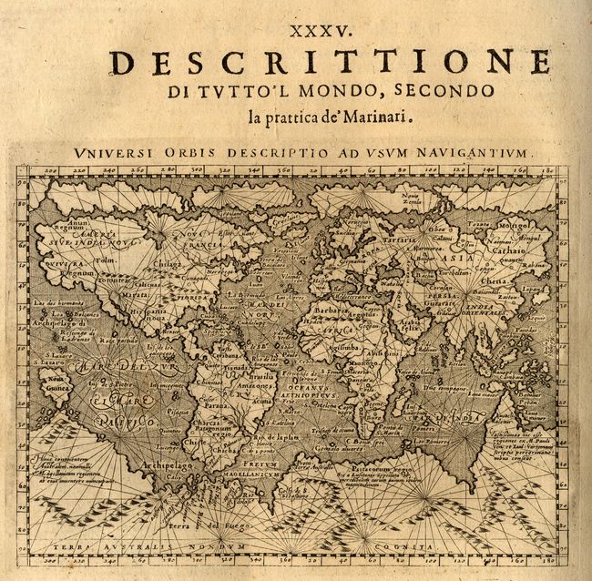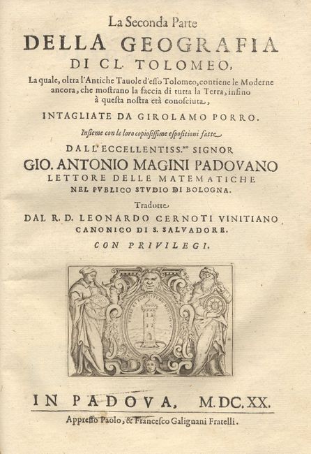 Italian edition of Magini's Ptolemy. Two parts in one thick quarto volume - Vol. II titled "La Seconda Parte Della Geografia de cl Tolomeo" and dated 1620. Rebound in red cloth covers. Two title pages, twenty-seven Ptolemaic maps and thirty-five modern maps. Includes a fine map of the Americas, and all four world maps by Girolamo Porro (Orbis Terrae Compendiosa Descriptio, Ptolemai Typus, Universi Orbis Descriptio, and Universi Orbis Descriptio ad Vsum Navigantium). All finely engraved in the Italian style with stippled seas. Numerous diagrams in text plus hundreds of small woodcut historated letters and other graphics. A very nice and complete atlas published by Pablo and Francesco Galignani. Maps very good to good with exception of Poloniae Regnum with heavy staining, tear and puncture.
