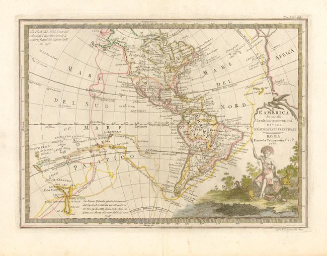A scarce map of the Americas featuring the discoveries of Captain Cook. In North America a possible Northwest Passage is labeled B. di Beering and Alaska (Algka) makes a very early appearance. Cook's three voyages are traced in the Pacific, where both islands of New Zealand and Hawaii are prominently shown. The location and date of Cook's demise is marked on I. Owhyea. The large title cartouche is set in a lush landscape with the allegorical female representation of America surrounded by native animals.