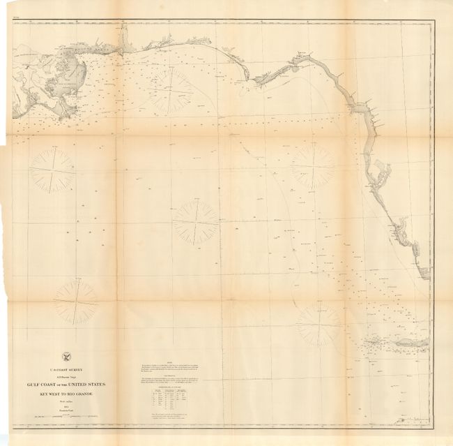 Matched pair of maps covering the coastline from Key West to the mouth of the Rio Grande. 1) "Eastern Part" (28 x 27.5") extends from Key West to beyond the mouth of the Mississippi River. 2) " Western Part" (22.7 x 28") finishes the coast line to the Rio Grande. Both with many soundings, magnetic variation compass roses, notes and table of abbreviations for bottom types with names of cities and islands along the coastline.