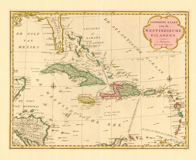 A fine, interesting chart of the Caribbean, also showing part of Florida, the Yucatan, and Central America. Even small islands are well-represented and navigational hazards are marked. Major sea routes are noted as well as the direction of the prevailing winds. Title cartouche and two compass roses decorate the chart.