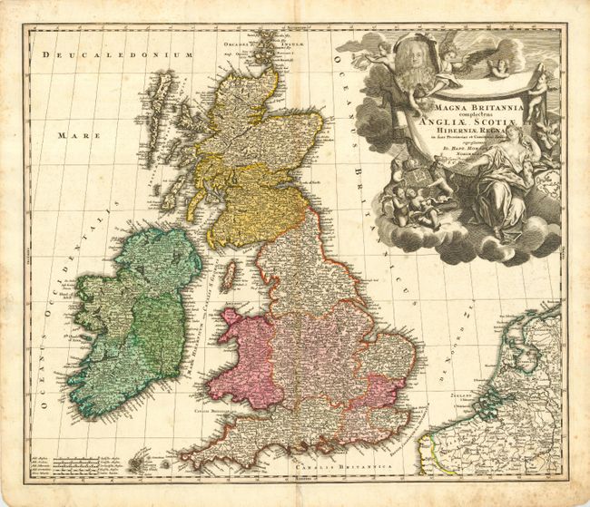 Large decorative map of the British Isles with a huge (uncolored) title cartouche featuring Europa and a host of putti in a cloud background with a portrait of King George I and the royal coat of arms.