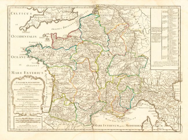 Large, handsome map of ancient France after Sanson. A table at right describes the regions.