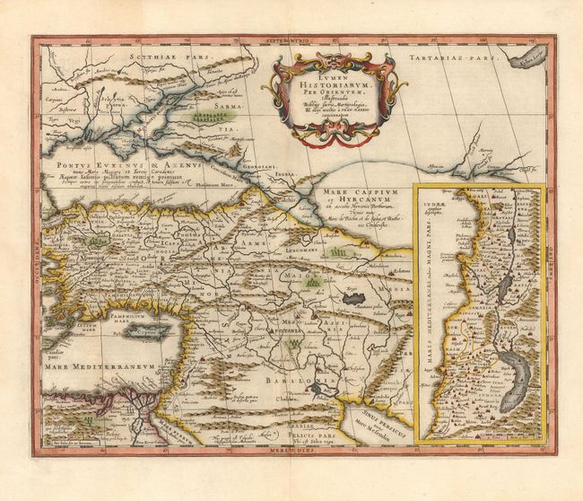 Fine map of the region from the eastern Mediterranean to the Persian Gulf based on the Ortelius/Vrients map of this name designed by Franciscus Haraeus. Includes a large inset map of the Holy Land. Shows the pyramids in Egypt, the route of Abraham from Ur to Sichem, and the wandering of the Children of Israel. This map was engraved by Kaerius, whose signature appears at bottom border, for Georg Horn's classical atlas, published by Jansson-Waesberg.
