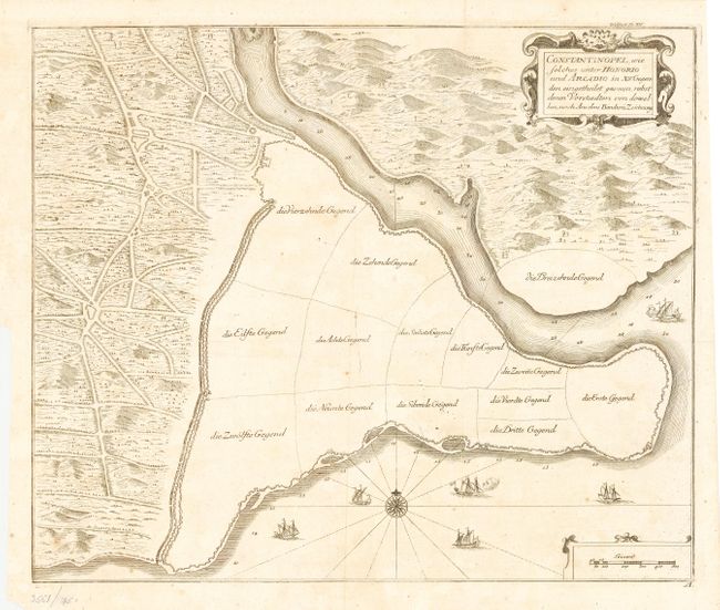 Two copper engravings showing the vicinity of present-day Istanbul. First (16.5 x 13.7") shows the fourteen neighborhoods of Constantinople with its fortifications. Several ships are shown in the sea and the map is decorated with strapwork cartouches and a compass rose. Second (11.2 x 8") illustrates the strategic position of the city and shows its fourteen divisions.
