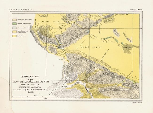 A map titled "Geological Map of the Tejon Pass & Canadas de las Uvas and the Vicinity. Including the Pass of San Francisquito & Williamsons Pass" 9 x 6.2". Details the region with topography shown via hachure.
