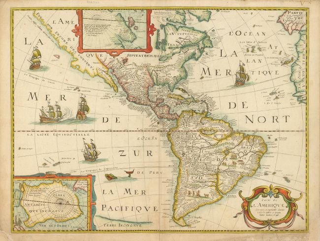 This is a scarce derivative of Hondius' influential map of 1618. This map was originally drawn by Petrus Bertius in 1624 (the first state of which is now extremely rare). This is the third state, published by Pierre Mariette. In this and the second state, the entire west coast was re-engraved above Baja California with the legend Pays Non Encore Descoverts (land not yet discovered). This reflects the then current controversy over whether or not California was an island. The map is finely ornamented with galleons, sea monsters, vignettes in the interior of South America, two insets, and a ribbon draped title cartouche.