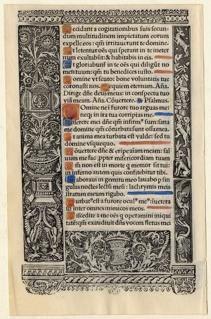A vellum leaf from an early printed Book of Hours. Gilles Hardouin's designs incorporated the traditions of Medieval manuscripts with illustrated panels printed from metal plates. The initial were written by hand in red, blue and gold.