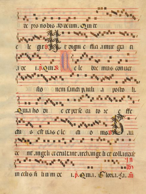 A vellum leaf containing eight staves of five-line music. Written in a fine hand with black, red, blue and gold ink. Each side contains decorative initials with delicate penwork.
