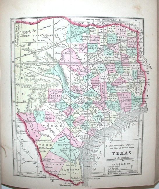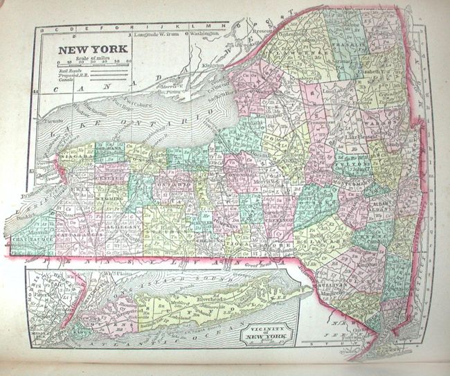 This is the complete American volume of the atlas, also known as the Diamond Atlas. Title page, preface, contents, text and scores of hand colored maps concentrating on the United States. There are individual state maps, hemispheres, several thematic world maps, North America, Canadian provinces and regional maps of the West Indies, Central and South America. This New Orleans edition of the Diamond Atlas is very scarce. Hardbound with gilt-stamped full leather cover, 8vo, 240 pages, gilt on all fore edges.