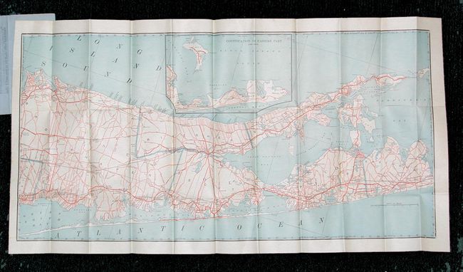 Folding pocket map printed on both sides to show western and eastern Long Island with an inset map of the very tip of the island. The map is very finely printed with a huge amount of detail and hundreds of roads. Extends to give excellent detail of Brooklyn and Manhattan. Map folds into blue paper wrappers titled "For Motorists and Cyclists. Road Map of Long Island Showing The Long Island Railway, Good Roads, Bicycle Paths, Long Distance Trolley Lines." Rear cover of this promotional piece prompts that Long Island is the "ideal location for a summer home or permanent residence... [with] 1,000 miles of perfect macadam and shell roads for Automobiling and Driving." Inside the cover is a list of all cities and towns with population and distance from Long Island City.