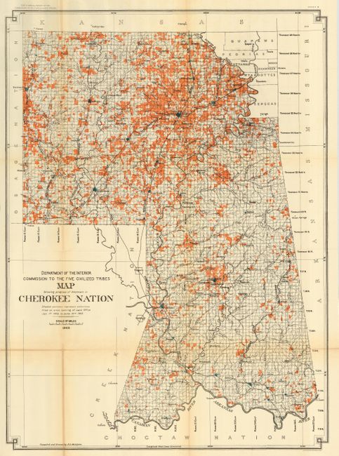 Five maps showing land allotments in detail for individual 'Civilized' Indian tribes, all printed by Bien. The maps were published by the Interior's "Commission to the Five Civilized Tribes" and were included in their Tenth Annual Report. Maps include: 1) Map Showing Progress of Allotment in Cherokee Nation, 26" x 35"; 2) Map of Chickasaw Nation Indian Territory, 30" x 33"; 3) Map of Chickasaw Nation Indian Territory Coal and Asphalt Segregation, 30" x 33"; 4) Map of the Chocktaw Nation Indian Territory Coal and Asphalt Segregation, 32.5" x 37"; 5) Map of Seminole Nation, 9.4" x 15.2". The first four map are compiled and drawn by R.L. McAlpine. A wonderful set of matching maps of Indian Territory just four years before the formation of the state of Oklahoma.