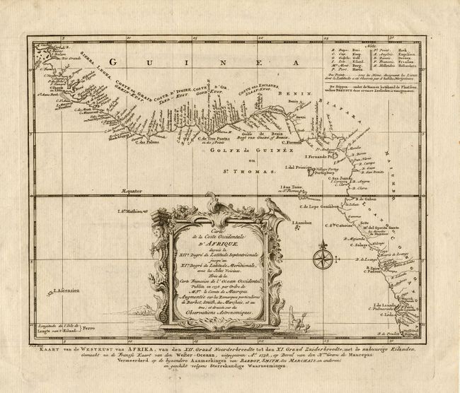 Two nice copper engraved maps showing the various European forts along the western coast of Africa. First, (12.5 x 8.2") by Willem Albert Bachiene, circa 1785, covers from Sierra Leone to Cape Negro. It is hand colored with a decorative title cartouche. The second map (9.5 x 7.5") is a Dutch edition of Bellin's map engraved by J. van der Schley, circa 1760. It covers a slightly larger section of the coast with a bit more detail including a key showing the various European powers. It is uncolored and embellished with a lovely title cartouche and a compass rose.