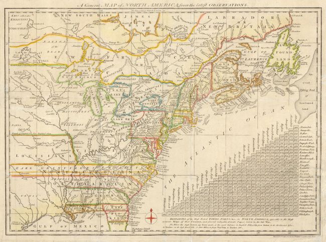 An interesting map showing the British view of their colonies at the outbreak of the American Revolution based on the cartography of Thomas Jefferys. It covers from James Bay to the Gulf of Mexico and provides many details about the frontier wilderness including numerous early forts, Indian villages and tribal territories. The mythical islands in Lake Superior are a hold-over from earlier French cartographers. The large triangular table at the lower right provides distances between major cities and forts. Shows Earl Granville's Property in North Carolina extending beyond the Mississippi River.