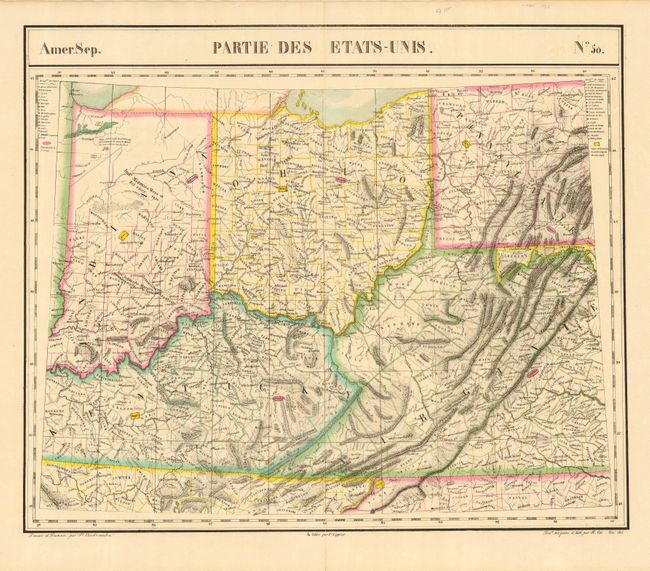 Important map that shows all of Ohio, most of Indiana, much of Kentucky, and the western part of Virginia and Pennsylvania. This was published in the first atlas to present all the maps on the same scale (1: 1,641,836) with each map covering an area of approximately 20 degrees longitude (from Paris) and 6 degrees of latitude. It is also considered to be the first lithographic atlas ever published. There was only one edition, published in 1825-27, and the subscription list shows that 810 copies were sold. A very nice example of a scarce map encapsulated in archival Mylar..