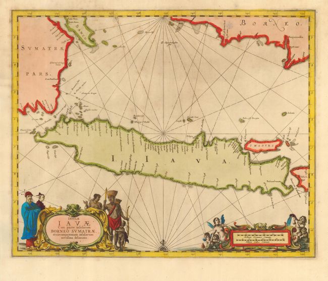 This elegant chart focuses on the island of Java with parts of Sumatra, Borneo and Bali. The lack of interior detail correctly reflects the state of knowledge of the period. The Dutch capital in the East Indies is located at Batavia (Jakarta) where a small fort is shown. The beautiful chart is richly embellished with two fine cartouches featuring natives and Chinese merchants flanking the title and Neptune and mermaids surrounding the scale of miles.