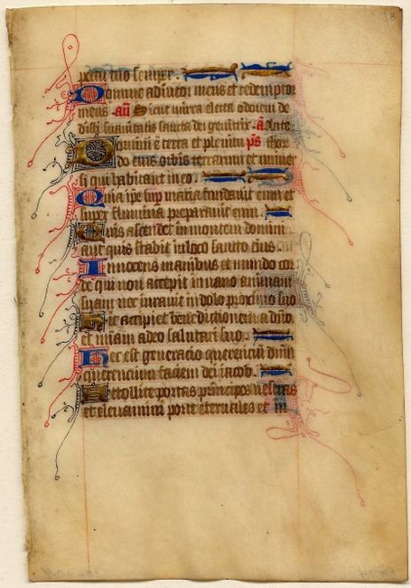 Fine vellum leaf from a French Book of Hours illuminated in blue, red and burnished gold leaf with numerous large initials, line fillers and marginal pen work. The text is in a regular gothic book hand in brown/black ink with rubrics in red. The text is from Psalm 23.