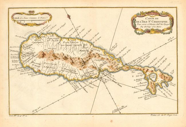 An attractive and very crisply engraved map that features two rococo-style cartouches, rhumb lines and a fleur-de-lys. Great detail of the mountains, rivers and anchorages.
