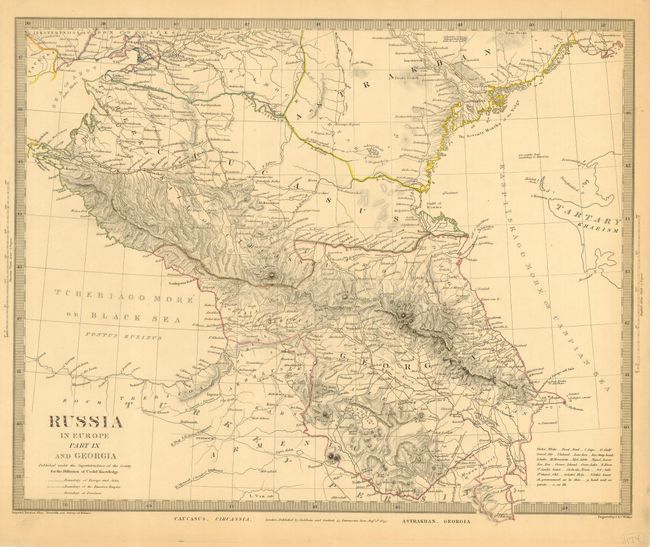 This finely engraved chart includes Georgia, Armenia, Astrakan and the Caucasus. Includes part of the Black Sea and the Sea of Azov. Filled with detail including watershed and mountains depicted with near three dimensional engraved lines. Keyboard style borders.