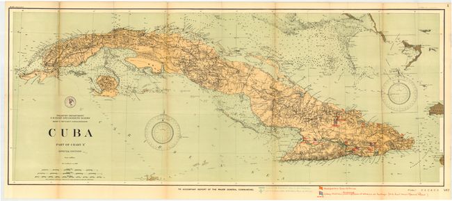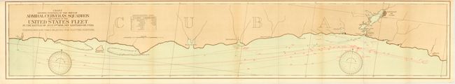 Set of highly detailed Spanish American War battle charts, the first three describing ship movements in great detail. 1) "Chart Showing the Positions of the Ships of Admiral Cervera's Squadron and Those of the United States Fleet in the Battle of July 3rd, 1898, Off Santiago de Cuba" (46.8 x 8.3") that shows the movement of and fate of each ship along the Cuban coastline from Santiago de Cuba west to beyond Tivijan Point. 2) "Chart Showing Daily Positions of Fleet in Campaign against Spanish Squadron under Admiral Cervera from May 15, 1898, to July 3, 1898" (18.3 x 8.3") is a fine overall map of Cuba, giving the larger picture of the naval conflict. 3) "Daily Positions of the Spanish Squadron under Admiral Cervera from April 9, 1898, to July 3, 1898 (Taken from the Log Book of the Cristobal Colon)" (11 x 7.5") details the squadron's movements from Cadiz, across the Atlantic to Martinique, Curacao and finally Cuba. 4) "Cuba Part of Chart 'E' Special Edition" (40.8 x 16.8") is a large and very detailed U.S. Coast and Geodetic Survey chart printed as a special edition to accompany the report of the Major General Commanding giving information on the progress of the war in Cuba. Location and number of Spanish and Cuba troops given by overprinted flag and text.