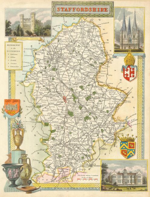 This decorative little map of Staffordshire provides detailed information of the county, cities, towns, roads, canals and parks. With finely rendered steel engraved vignettes of Stafford Castle, Lichfield Cathedral, and the Ingestre House, Seat of Earl Talbot. Embellished with an elaborate border, two coats of arms, and several Roman vases and pitchers. Thomas Moule was a bookseller and writer on heraldry and antiquities. His well-known series of county maps are the last series of decorative county maps to be published in England.