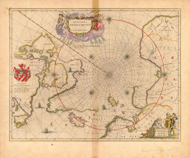 This is one of the prototype maps of the Arctic. It incorporates new information from the explorations of Capt. Thomas James with the bay named for him labeled here James his Bay. The Arctic coast of Russia provides information from Willem Barentsz' voyage and Spitsbergen is shown according to the Danish expedition of James Hall. It depicts rhumb lines radiating from the North Pole. A large title cartouche, with two figures and numerous wind heads, conveniently hides the northwest coast of America. The map is further decorated with several compass roses, ships and an additional cartouche that features men in parkas, a polar bear and foxes. Dedication to Guilielmo Backer de Corneliis (signed by Joan Blaeu), which indicates this issue is from the second state of the plate. French text on verso.