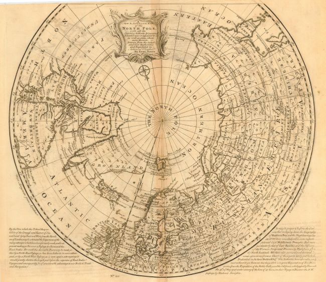 Handsome polar map covering the region north of 50 degrees latitude. It contains numerous notations concerning recent discoveries and the entire western part of North America is labeled Parts Undiscovered. There is also a notation of a Newly Discover'd Sea that is totally fictitious. At bottom are lengthy English text panels describing the possibilities of still discovering northeast and northwest passages to Asia. Nicely decorated with a title cartouche and compass rose.