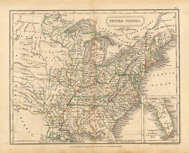 Nice lot of maps of the United States with the first two showing the Independent Republic of Texas. Includes 1) "United States" by W. & R. Chambers, Edinburgh, circa 1840, outline color (10 x 8") (A). 2) "Etats-Unis et Nouvelle Bretagne" by Louie Antoine, Paris, circa 1840, outline color (11.2 x 8.5") (A+). 3) "The United States of America, according to the Treaty of Peace of 1784" anon., circa 1795, full color (7.8 x 7") (A). 4) "United States" by Archd. Fullerton & Co., Glasgow, circa 1821, uncolored (10 x 8") foxing (C). 5) "United States" by Sydney Hall and Longman, Rees, Orme, Brown & Green, London, circa 1821, outline color (9.5 x 7.5") (B). 6) "United States" anon., circa 1825, full color (9.8 x 8") (A). 7) "United States" by Orr & Smith, London, circa 1845, uncolored (8.2 x 10") centerfold toning (B). Nice collection of maps of the young United States.