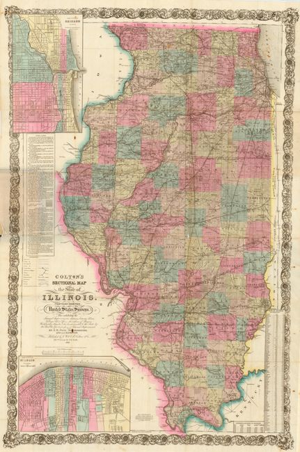 Large and highly detailed pocket map that was created by J.M. Peck, John Messenger, and A.J. Mathewson. The map folds into original brown boards (4 x 6") with embossing and gilt title. It provides a most interesting contrast to the previous lot that is nearly identical, just 15 years earlier. The map contains a huge amount of information and is surrounded by a scroll-style decorative border. Two large insets: "The City of Chicago Illinois" and "City of St. Louis." With extensive legend, distance scales, table giving population of towns and villages, and large table discussing Public Land and Land Districts. A nice example that is in surprisingly good condition.