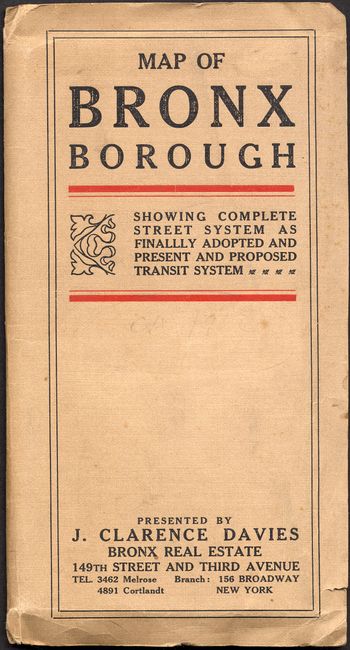 A large real estate development pocket map for the J. Clarence Davies Real-estate company in the Bronx. The map folds into linen paper wrappers, titled "Map of Bronx Borough Showing Complete Street Systems as Finally Adopted, and Present and Proposed Transit Systems." The map extends to include parts of New Rochelle and Yonkers. Locates several parks including Pelham Bay, Van Cortlandt, and the Bronx Park. The legend locates Elevated Lines, Proposed Elevated Lines, Subway Lines and proposed lines, NY Westchester & Boston Railway, Steam Railroads, and Trolley Lines. A great land promotion map in fine condition that was published by the A.R. Ohman Map Co.