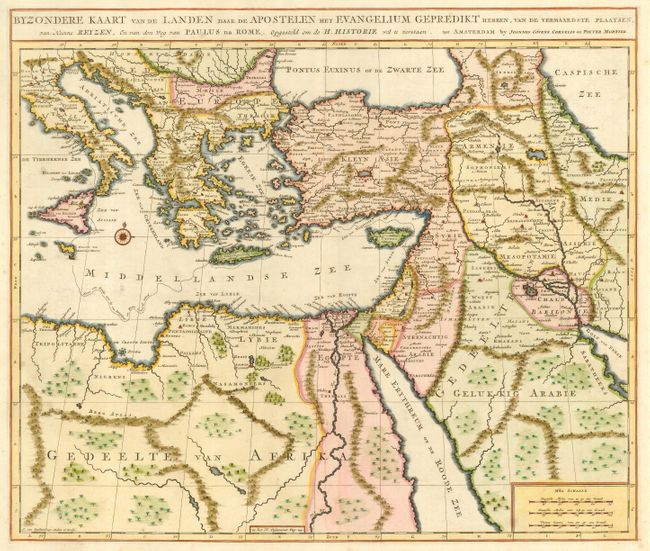 Nicely engraved map of the eastern Mediterranean and the Middle East featuring the tract of St. Paul from Jerusalem to Rome. The map is filled with mountains, forests, and oases, and is decorated with a compass rose.