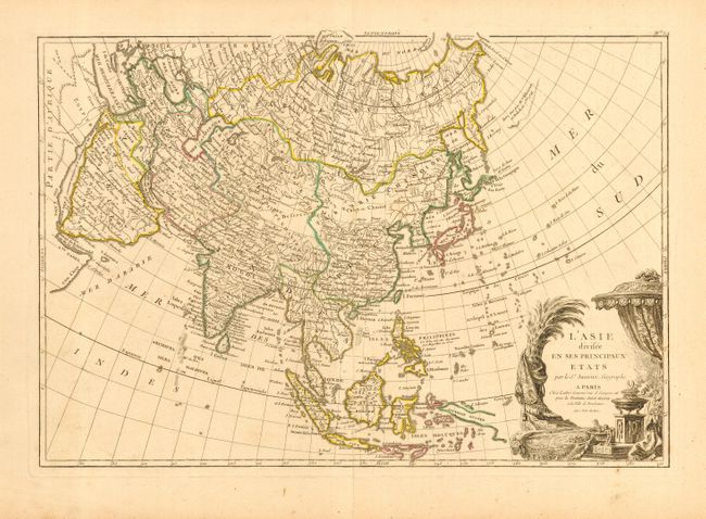 Attractive chart of Asia including the East Indies. It presents a fairly accurate and up-to-date outline of the continent. However, there is still some confusion in the region of Hokkaido and Sakhalin Island. The Bering Straits are identified as Detroit du Nord ou d'Anian. The Aleutian Islands are hinted at with an indistinct coastline east of Kamchatka noting that it was discovered by Chirikov & Delisle in 1741. The decorative cartouche features the wealth of the region including Persian rugs, textiles, jewels and an incense burner.