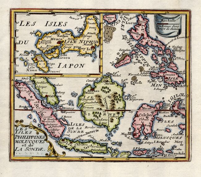 This is a very close copy of Nicolas de Fer's map of the islands of Indonesia and the Philippines with a particularly noteworthy inset map of Japan. The main map is primarily based on Sanson's important map of the same title. However the map of Japan shows various influences resulting in a unique shape. Shows the cities and smaller settlements, rivers, mountain chains, and even forests. The equator is marked and latitude and longitude indications are in the borders.