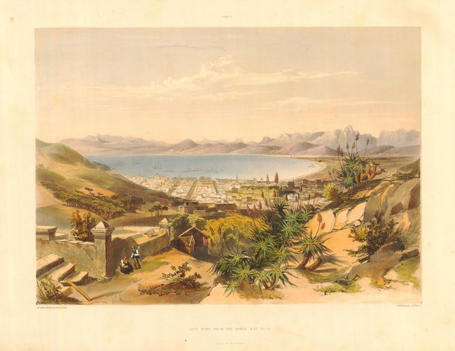 The lot includes: "Cape Town, from the Camps Bay Road (Plate 1)" which is a very finely rendered bird's-eye view of the town and harbor with numerous sailing ships at anchor. "Mouth of the Umvoti on Indian Ocean (Plate 18)" shows an expanse of ocean and the mouth of the river, which was later renamed to the Mavootie. In the foreground are four lions. The next print (Plate 21) shows a Zulu village with the title written on the stone in Angas' hand "Zulu Kraal at Umlez with huts & Screens." Shows ten natives engaged in daily activities. The two at far right are warriors who are wearing the traditional head ring, made from the bark of trees and grass, that is actually stitched to their scalp. "Zulu Blacksmiths at Work" shows them operating bellows, heating metal and working with ore. The kraal (fence) behind the men is a cattle pen. Living quarters are to the left. Some great pots and baskets can be seen in the background. All are on a full sheet 21.5 x 14.3" with wide margins less the third print which is slightly trimmed at top and sides to 18.7 x 13.8 inches.