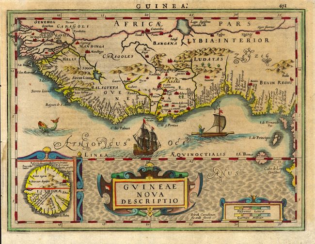 Reduced version of the super map of western Africa from Senegal, Rio Senega, to Cape Lopez on the Gulf of Guinea just below the equator. The map reflects the Portuguese exploration and settlement in the region and includes a large inset of the Island of St. Thomas. Beautifully embellished with strapwork cartouches. The sea displays a sea monster, a Portuguese ship and native sailing boat. Latin text on verso.