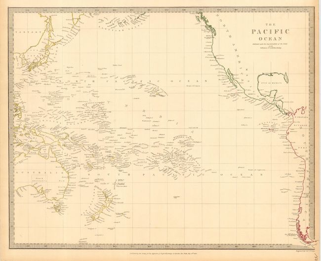Pair of great maps of the Pacific. First shows the entire ocean with the coastlines of North and South America (Prince of Wales Island to Tierra del Fuego) and in Asia from Russia and Korea to New Zealand. Second is an interesting sheet with numerous inset maps of the islands, each with great detail. This is one of the few maps available with details of even the tiniest islands. Both enclosed in keyboard style borders.